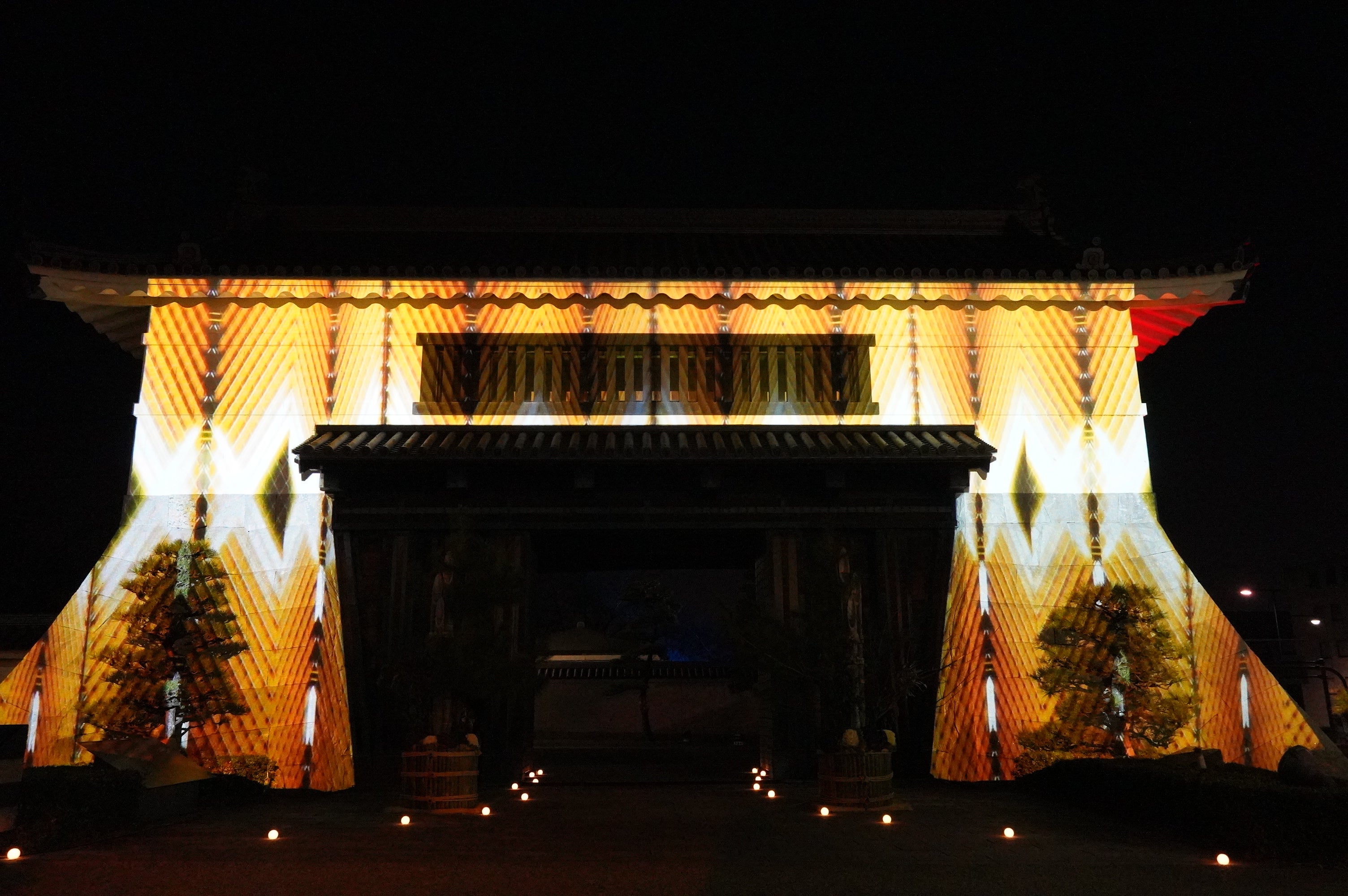 【内容】 徳川家康生誕の地・岡崎城の表玄関で幅16.4メートル・高さ11メートルの大手門に、岡崎市が誇る文化財などをモチーフとしたプロジェクションマッピング映像を投影します。また「岡崎城大手門 デジタルペインティング募集」の応募作品の中から選出された作品をインターミッションコンテンツとして投影します。