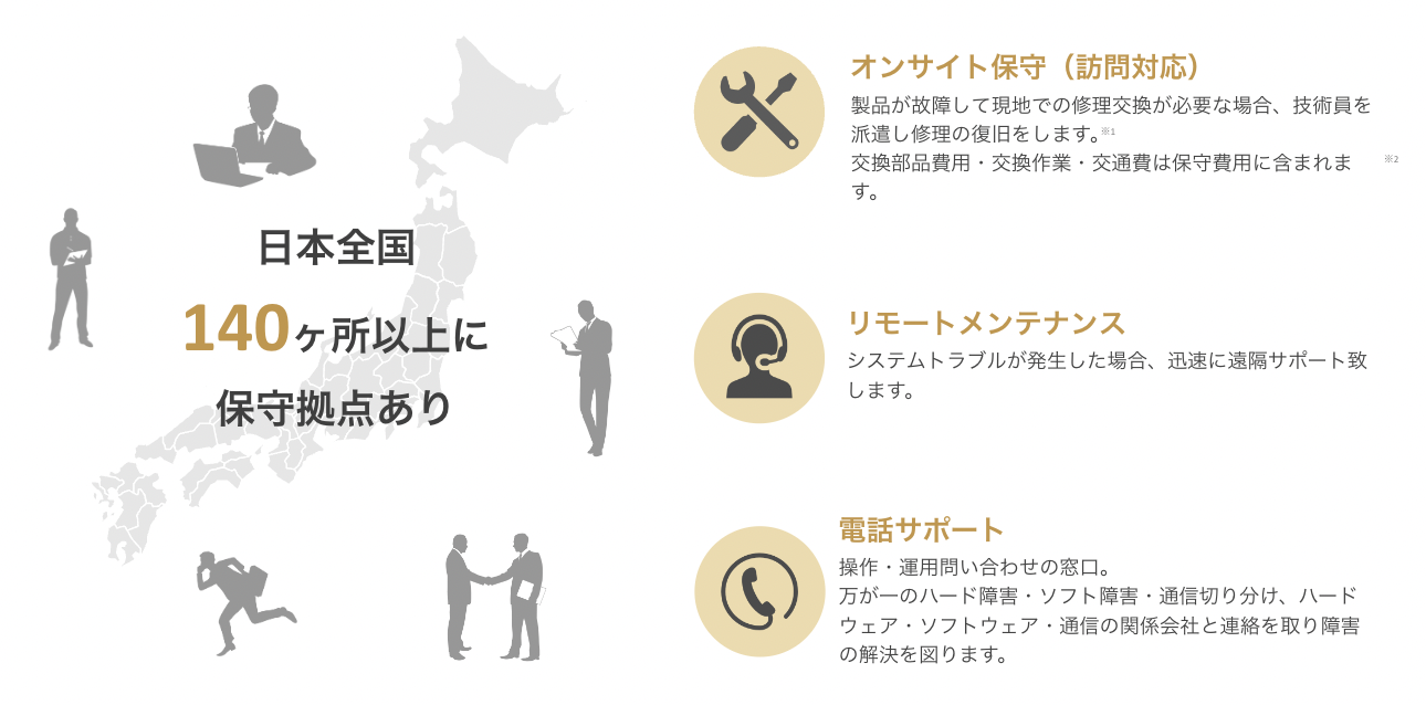 電話やメールでの遠隔サポートはもちろん、製品故障による現地修理が必要な場合にも全国140カ所以上に設置している保守拠点からスタッフが対応いたします。