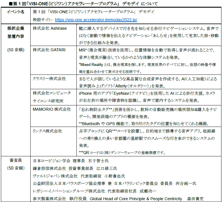 VISI-ONEアクセラレータープログラムは、VISI-ONEプロジェクトの一環として、今年2月より、視覚障がいに関わる“6つの壁” (①オンラインの壁、②オフラインの壁、③能力の壁、④働き方の壁、⑤つながりの壁、⑥思いがけない壁)を溶かす募集領域に対して、新規事業創出を図る企業や団体から事業化アイデアを募集しました。既存ビジネスに捉われない新しい発想や異分野からの技術応用を幅広く受け入れ、視覚障がいがありながらもビジネスの最前線で活躍するメンターやアドバイザーと協働しながら、“壁”を溶かし、かつ事業性を追求できる製品やサービスの創出を支援する取り組みです。7月に採択企業6社を決定し、7月~9月にかけて行われたコンセプト実証の成果発表をこの度のデモデイで行いました。