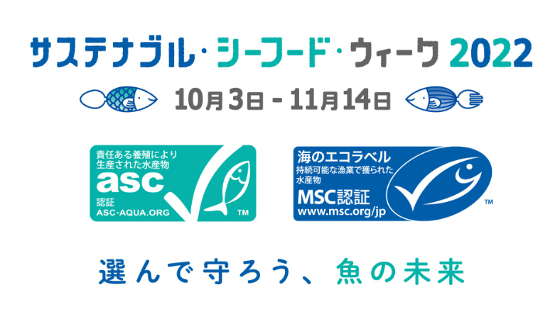 持続可能な水産資源や環境に配慮し適切に管理されたMSC認証を取得した漁業で獲られた水産物、あるいは環境と社会への影響を最小限に抑えたASC認証を取得した養殖場で育てられた水産物を「サステナブル・シーフード」といい、消費者や水産業に関わる企業が、「サステナブル・シーフード」を認知し、選択することの大切さを感じてもらうためのキャンペーン期間です。今年で9回目を迎える「サステナブル・シーフード・ウィーク」のテーマは昨年に引き続き「選んで守ろう、魚の未来」として、2022年10月3日から11月14日まで開催しています。