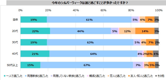 今年のシルバーウィークに出かけた方は71%、出かけていない方は29%でした。出かけた方は主に同居家族と一緒に過ごし、食事にお金をかけています。コロナ前後で一緒に過ごす人や最もお金をかけるものに変化はありませんでしたが、宿泊にお金をかけていた人が減少するなど62%の方が過ごし方に変化があったとしています。