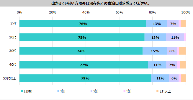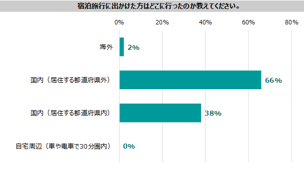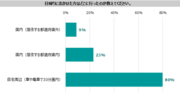 出かけた方のうち76%は日帰りでのお出かけで、自宅から車や電車で30分圏内周辺の日常的に利用しているショッピングモールなどで過ごすことが多かったようです。一方、宿泊した24%のほとんどの方が国内での滞在となりました。主にグルメ、観光を重視して楽しみ、91%の方が宿泊旅行に満足したと答えています。