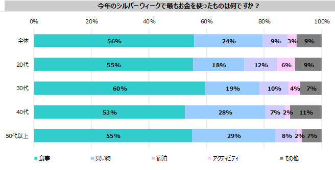 今年のシルバーウィークに出かけた方は71%、出かけていない方は29%でした。出かけた方は主に同居家族と一緒に過ごし、食事にお金をかけています。コロナ前後で一緒に過ごす人や最もお金をかけるものに変化はありませんでしたが、宿泊にお金をかけていた人が減少するなど62%の方が過ごし方に変化があったとしています。
