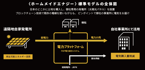 従来の太陽光発電の自家消費モデルは電気を使用する施設の屋根上か、隣地に発電システムを建設し、送電線を介さずに電気を施設に引き込む「オンサイト型」が通例でしたが、この度自己託送制度を活用した自家消費システムを開発しました。