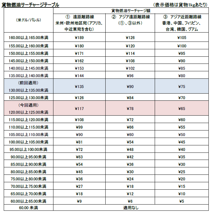 JALは日本発国際貨物燃油サーチャージの改定時期を年12回(毎月)としており、また、各月の貨物燃油サーチャージ額は「シンガポールで取り引きされるジェット燃油(ケロシン)価格の前々月の平均値」を燃油指標価格として、2022年4月より導入した以下テーブルに従いサーチャージ額を決定します。