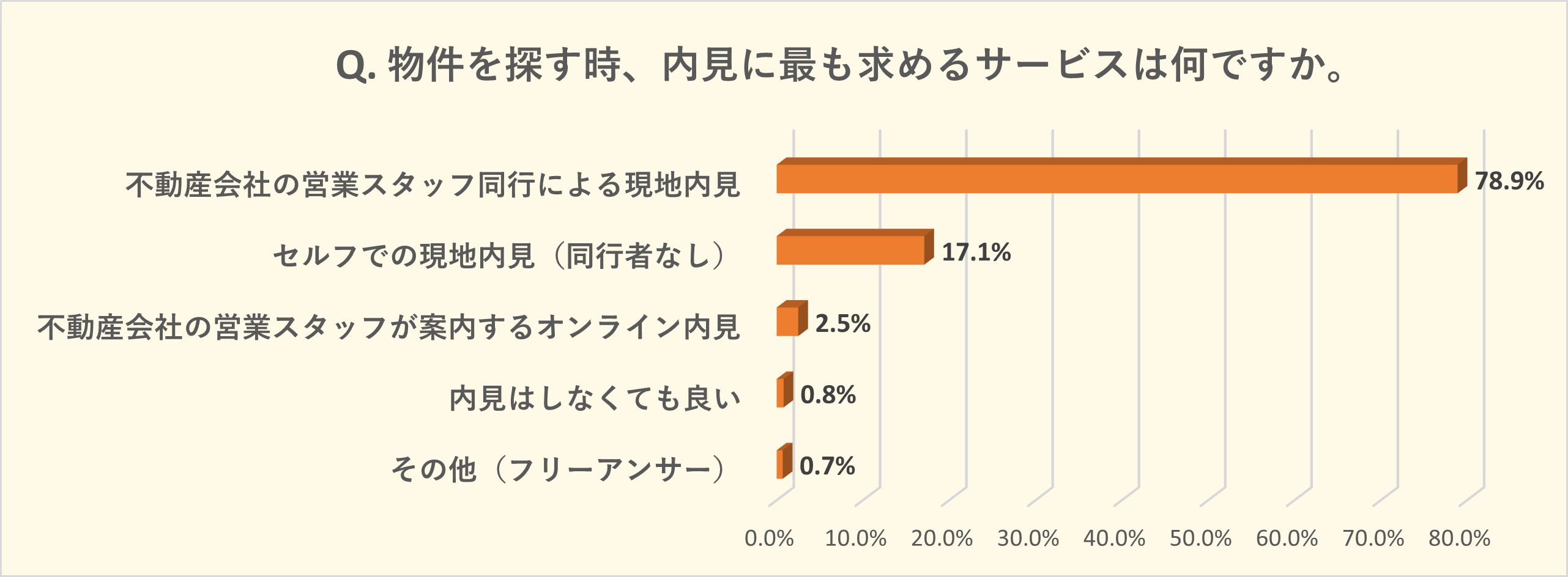 1) 内見に最も求めるサービスは従来のスタイル「不動産会社同行による現地内見」が78.9%で1位。新たな内見スタイル「セルフでの現地内見(同行者なし)」は17.1%で2位の得票となった。