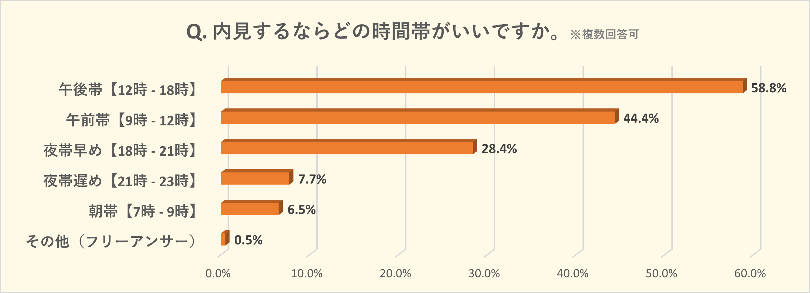 次に、内見を実施する希望の時間帯についてお伺いしました。