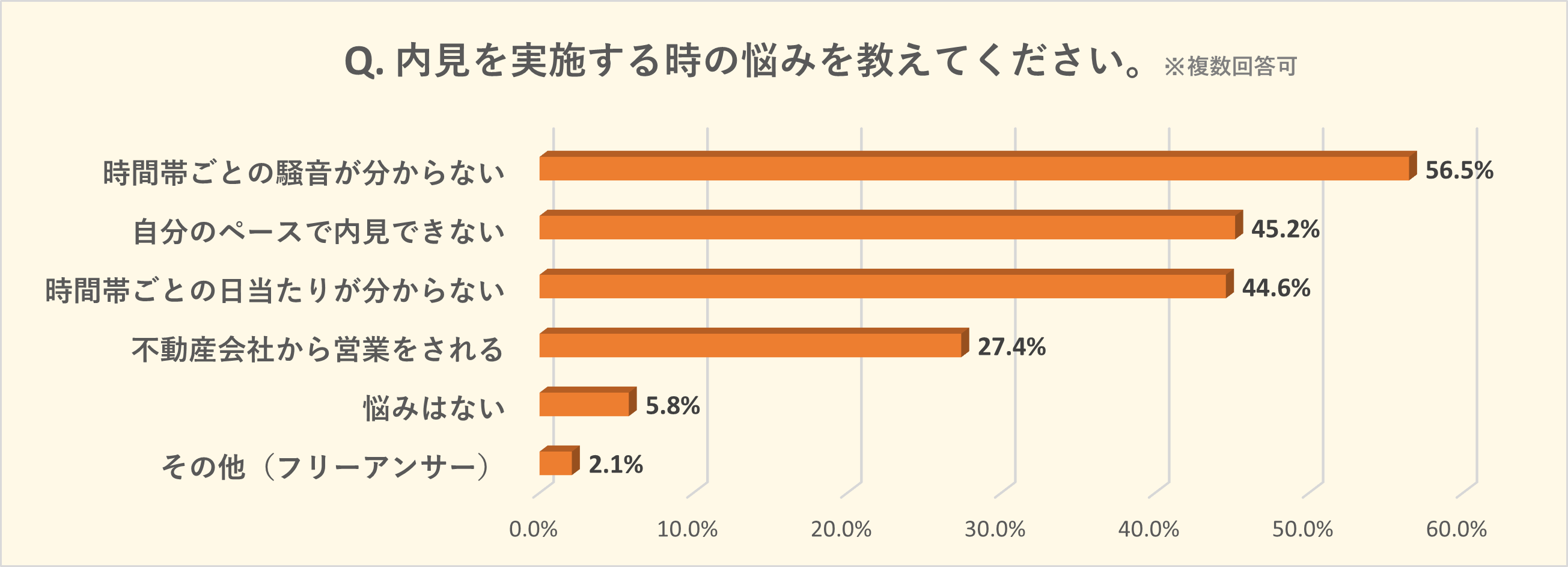 回答では1位「時間帯ごとの騒音が分からない」56.5%と3位「時間帯ごとの日当たりが分からない」44.6%という、物件の情報収集不足に対するお悩みが高い得票率となりました。また、2位は「自分のペースで内見できない」45.2%で、不動産会社の同行や時間の制約などで自由な内見ができていないことがお悩みの要因だと考えられます。