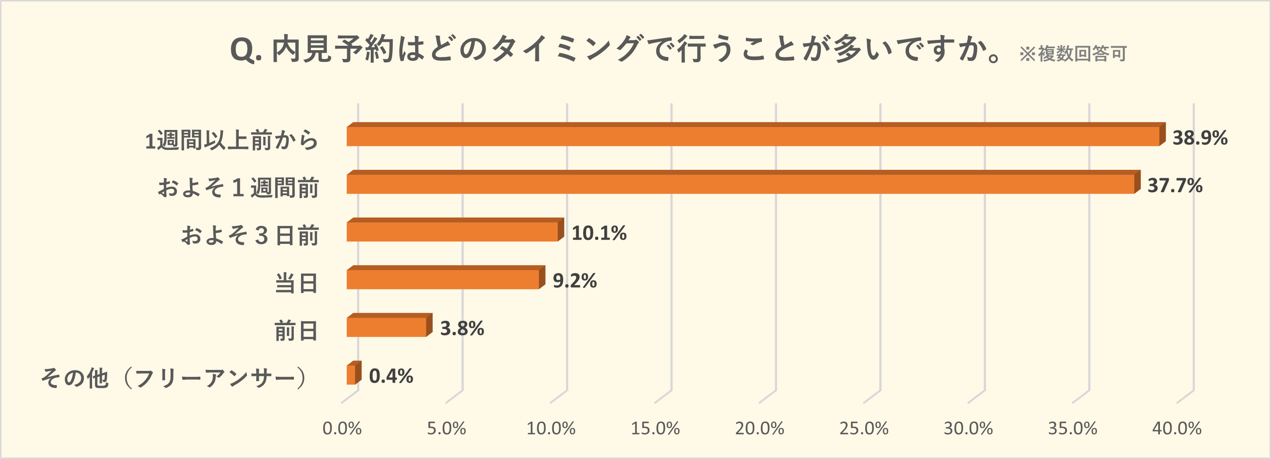 回答では1位「1週間以上前から」38.9%、2位「およそ1週間前」37.7%となっており、余裕を持った内見予約をされている方が圧倒的に多い事が分かりました。回答者を賃貸物件、売買物件それぞれの属性に分けてもその結果は大きく変わることはありませんでした。