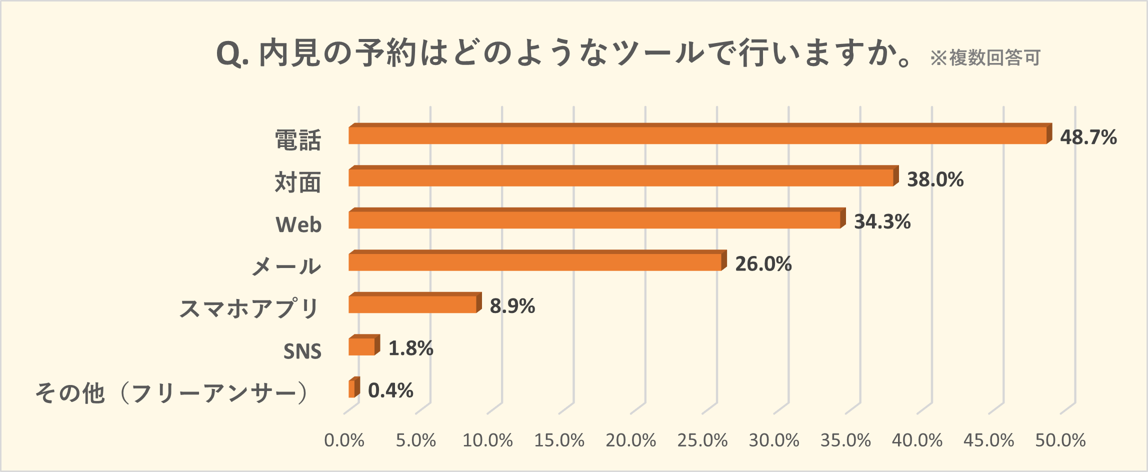 様々な予約のシステムが登場している中でも、従来からの手法である1位「電話」48.7%と2位「対面」38.0%がTOP2となりました。スマホアプリやSNSなどの活用はまだ十分に浸透していない一方で、3位「Web」は34.3%となり一定の得票率となりました。