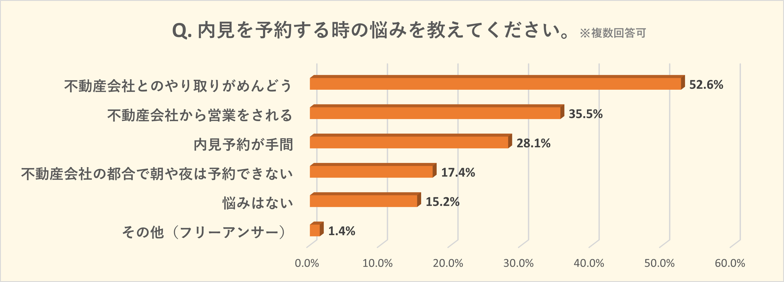 2) 内見予約時の悩みは 「不動産会社とのやり取りがめんどう」52.6%と「不動産会社から営業をされる」35.5%という、不動産会社に関する項目がTOP2となった。