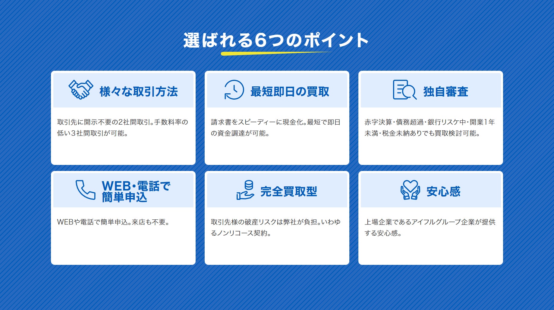 アイフルビジネスファイナンスは様々なニーズの資金調達にお応えすべく、調達までのスピードを重視される事業者様向けに、ファクタリングサービスを一新し、最短即日で売掛金の買取が可能なファクタリングサービスを開始しました。