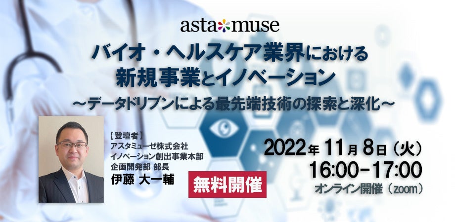 今回、それらのデータから抽出したバイオ・ヘルスケア分野での研究・事業の動向や最新の海外事例等を踏まえ、バイオ・ヘルスケア業界における新規事業やイノベーションをいかにして作っていくのか、その具体的な思考や手法についてをお話させていただきます。