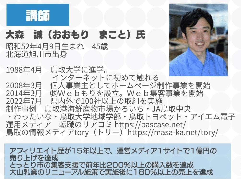 SNS広告や広報事業を展開する株式会社Webもり(本社:鳥取県鳥取市)の代表取締役・大森誠が、鳥取商工会議所主催の「SNSを活用した販路拡大セミナー」に登壇いたします。