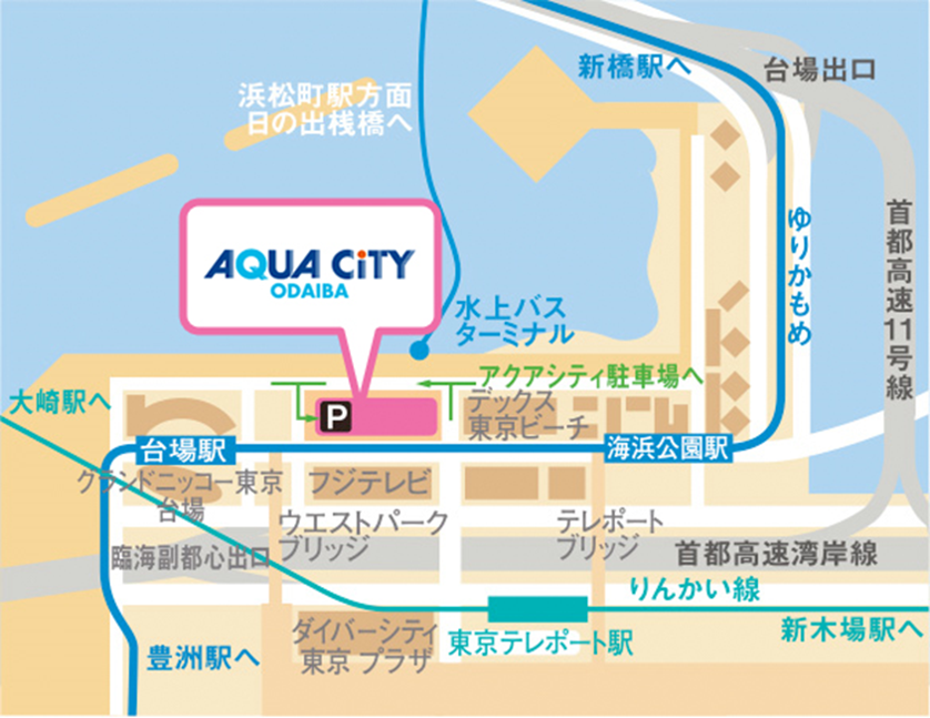 お台場海浜公園に隣接し、自由の女神とレインボーブリッジ越しに都心を臨む絶好のロケーションにある大型複合ショッピングセンター。 爽やかな海風を感じるカジュアルファッションを中心に、約60店が集まったショッピングゾーン。 和・洋・中・イタリアン等、バラエティ豊かなレストランが並ぶ、臨海地区最大級のグルメゾーン。日本初上陸の3面マルチ上映システム「ScreenX」や4DX®を楽しむことができる大型シネマコンプレックス(複合映画館)。さらに、上階には、「東京ラーメン国技館 舞」や7つの願いが叶うと言われる神社「アクアシティお台場神社」もあり、一日中お楽しみ頂けます。