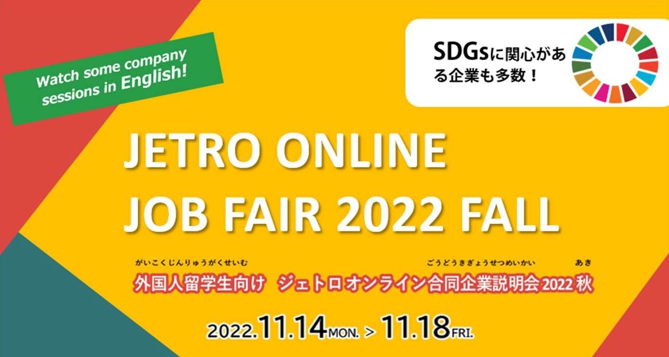 独立行政法人日本貿易振興機構(ジェトロ)が主催し、文部科学省と厚生労働省との共催で、国内最大級の外国人留学生向け採用イベント「ジェトロ オンライン合同企業説明会 2022 秋」を11 月14 日(月曜)より5 日間開催します。国内37 都道府県に所在の中堅・中小企業126 社が参加します。