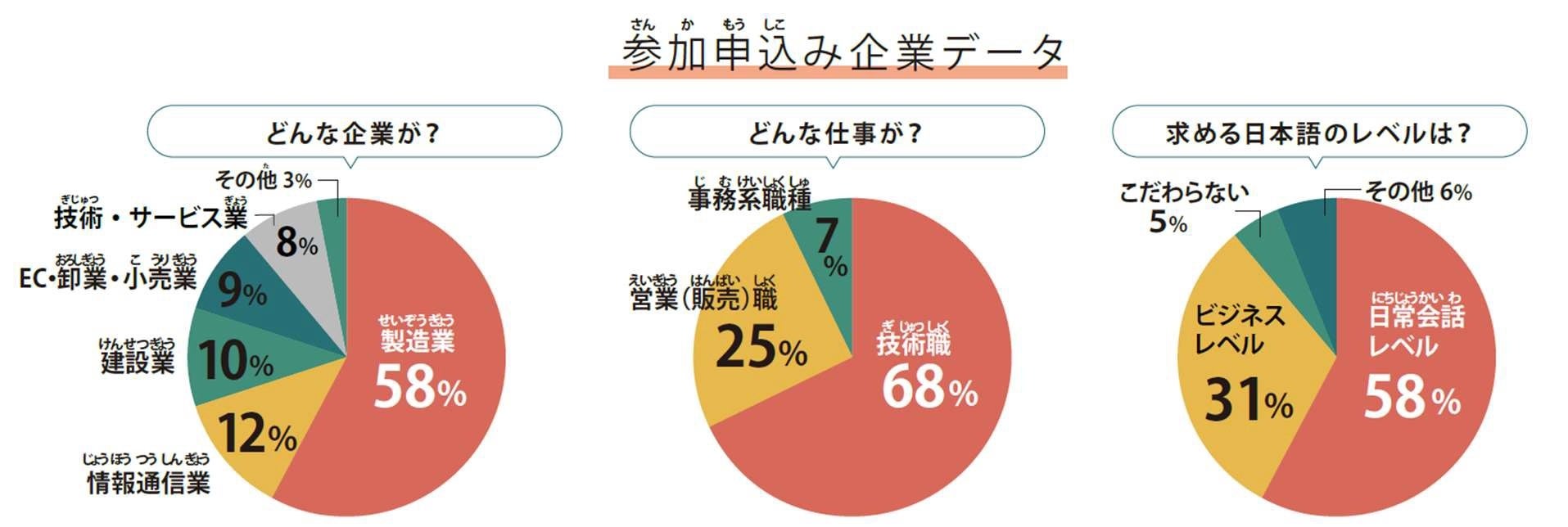 また、業種別で見ると製造業が58%と半数以上を占め、前回の50%から8 ポイントの増加。職種別では技術職が68%と前回の58%から10 ポイントも増加し専門職の募集が多いこと、加えて外国人求職者に求める日本語のレベルはビジネスレベルが31%と、回を追うごとに低くなっており、語学力よりもより専門性を備えた高度外国人材へのニーズが高まっていることが伺えます。