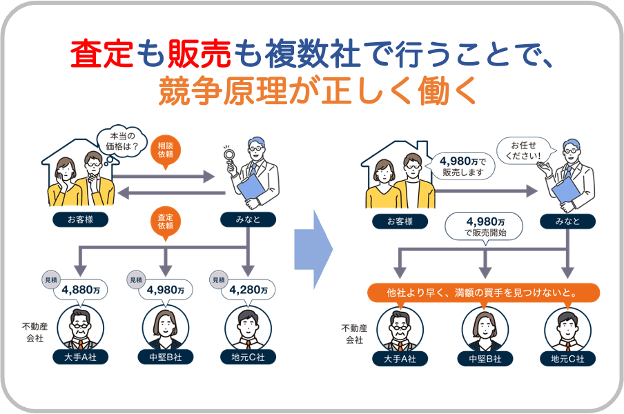 当社にはお客様と利益相反する要素がありません。一般媒介の締結を前提に査定を依頼することから、専属専任を目的としてお客様の関心をひくためだけの無責任な高い査定が横行する一括査定サイトとは違い、「本当の査定」を大手不動産含め複数社から取得できる為、お客様は不動産の正しい価値を知ることができます。(取得した査定に合理性がない場合は一般媒介も断ります)