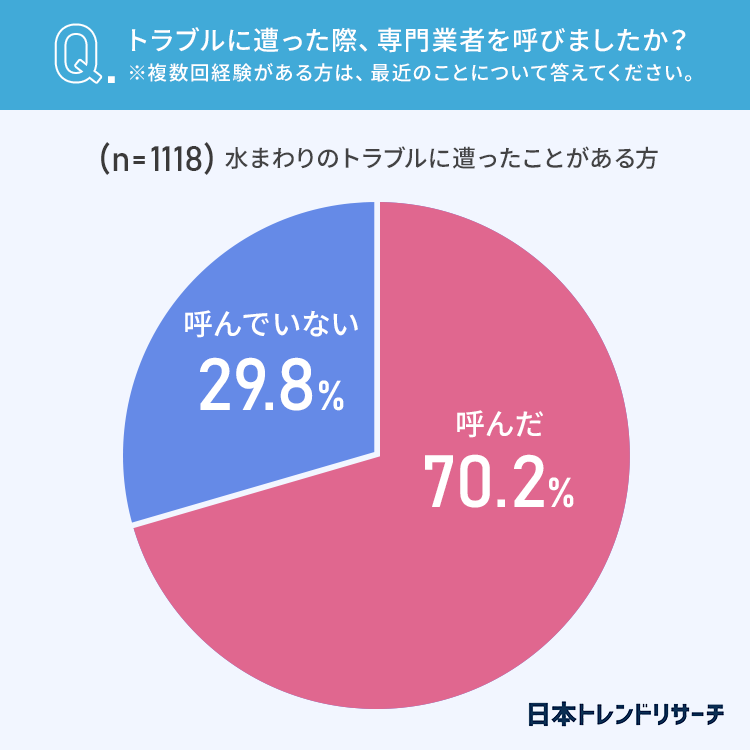 水まわりのトラブルに遭ってしまったことがある方のうち70.2%が、専門業者を「呼んだ」と回答しました。