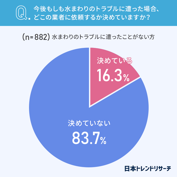 一方で、水まわりのトラブルに遭ったことが無い方は、83.7%がいざという時に依頼する業者を決めていないようです。