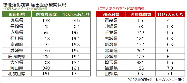 2022年9月時点で「機能強化加算」を届出ている医療機関数は、全国で14,789(診療所:13,478 病院:1,311)10万人あたりの医療機関数は、約11.74件(人口データ、令和4年1月1日住民基本台帳) 2022年度診療報酬改定前の調査では、人口10万人あたり12.43件(2021年12月時点、人口データ令和3年1月1日住民基本台帳)と比較して、約0.7 減少しています。