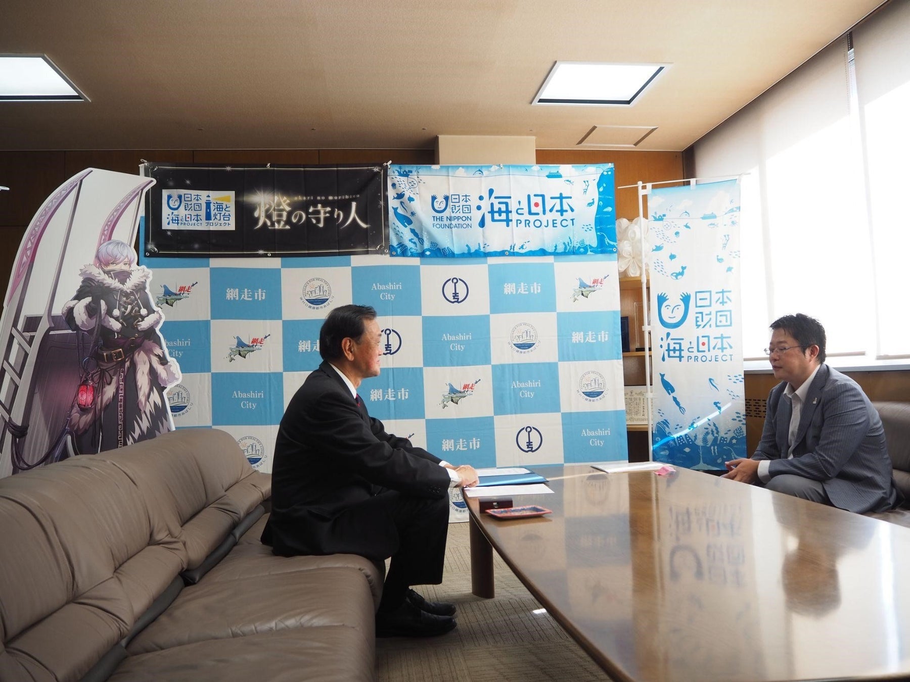 燈の守り人キャラクターを活用して、地域の灯台を歴史・文化資産として活用する機運をつくるため、キャラクター化の対象となる「能取岬灯台」が立地している北海道網走市の水谷洋一市長を、「燈の守り人」製作委員会プロデューサーの柴田英知が2022年10月14日(金)に表敬訪問し、キャラクターの贈呈式を実施しました。
