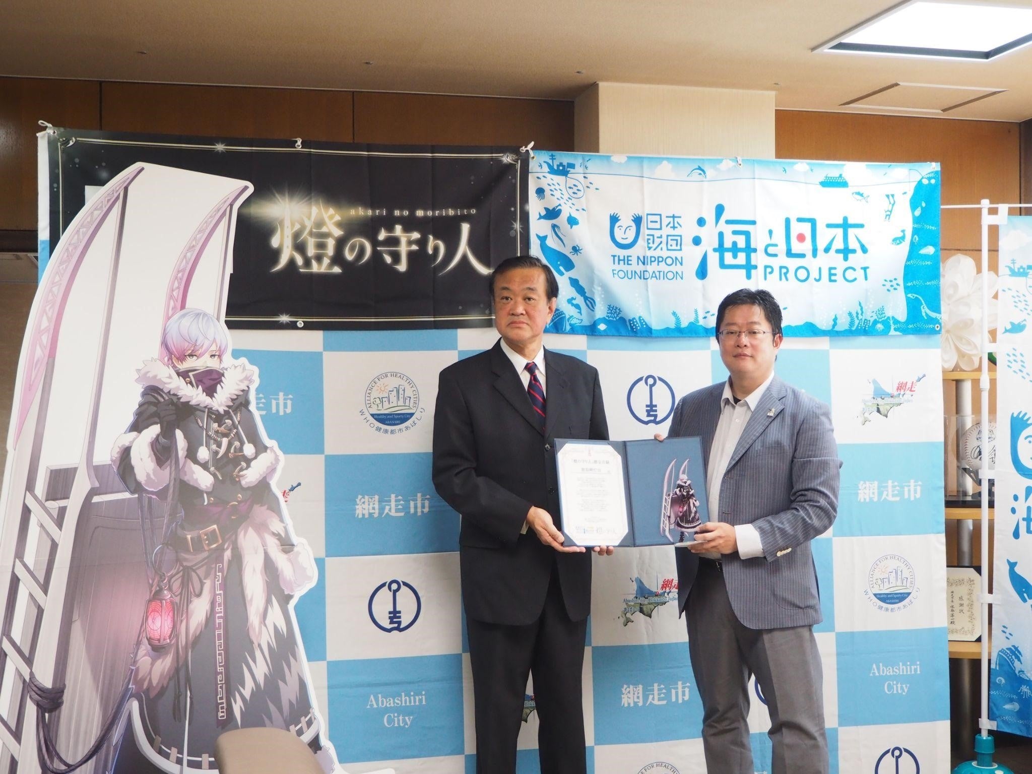 燈の守り人キャラクターを活用して、地域の灯台を歴史・文化資産として活用する機運をつくるため、キャラクター化の対象となる「能取岬灯台」が立地している北海道網走市の水谷洋一市長を、「燈の守り人」製作委員会プロデューサーの柴田英知が2022年10月14日(金)に表敬訪問し、キャラクターの贈呈式を実施しました。