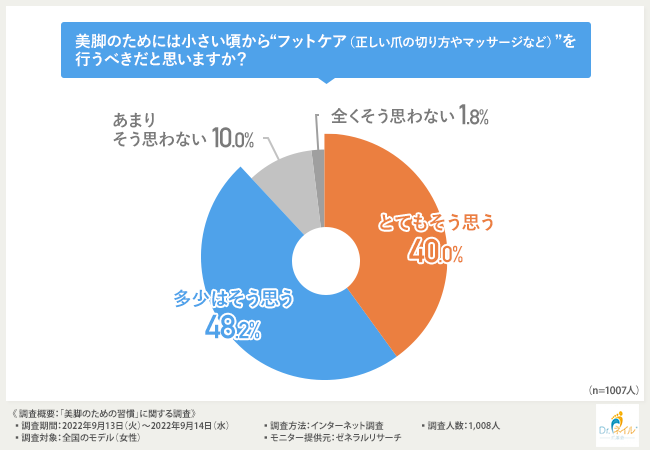 「美脚のためには小さい頃から“フットケア(正しい爪の切り方やマッサージなど)”を行うべきだと思いますか?」と質問したところ、『とてもそう思う(40.0%)』『多少はそう思う(48.2%)』『あまりそう思わない(10.0%)』『全くそう思わない(1.8%)』という回答結果になりました。
