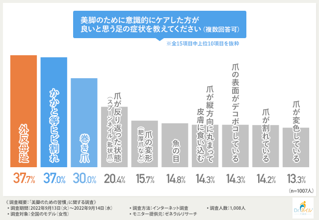 「美脚のために意識的にケアした方が良いと思う足の症状を教えてください(複数回答可)」と質問したところ、『外反母趾(37.7%)』と回答した方が最も多く、次いで『かかと等ヒビ割れ(37.0%)』『巻き爪(30.0%)』『爪が反り返った状態(スプーンネイル・匙状爪)(20.4%)』『爪の変形(肥厚爪など)(15.7%)』『魚の目(14.8%)』『爪が縦方向に丸まって皮膚に食い込む(14.3%)』『爪の表面がデコボコしている(14.3%)』と続きました。