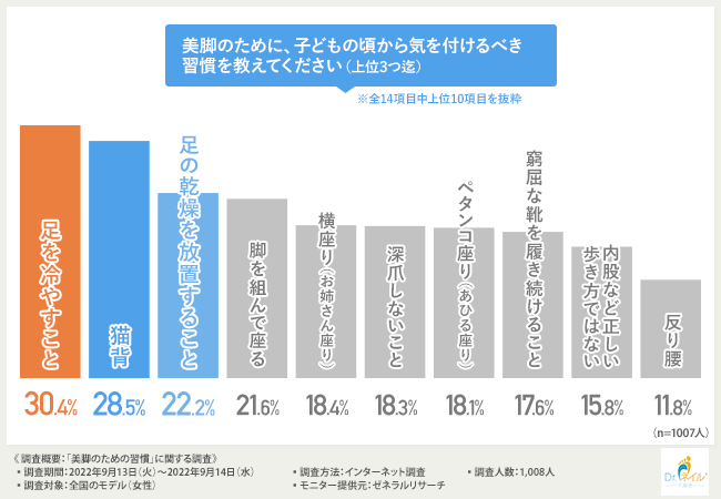 そこで、「美脚のために、子どもの頃から気を付けるべき習慣を教えてください(上位3つ迄)」と質問したところ、『足を冷やすこと(30.4%)』と回答した方が最も多く、次いで『猫背(28.5%)』『足の乾燥を放置すること(22.2%)』『脚を組んで座る(21.6%)』『横座り(お姉さん座り)(18.4%)』『深爪しないこと(18.3%)』『ペタンコ座り(あひる座り)(18.1%)』『窮屈な靴を履き続けること(17.6%)』と続きました。