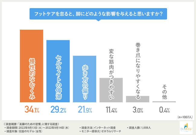 そこで、「フットケアを怠ると、脚にどのような影響を与えると思いますか?」と質問したところ、『慢性的なむくみ(34.1%)』と回答した方が最も多く、次いで『セルライトの停滞(29.2%)』『歩き方の偏り(21.9%)』『変な筋肉がつきやすい(11.4%)』『巻き爪になりやすくなる(3.0%)』と続きました。