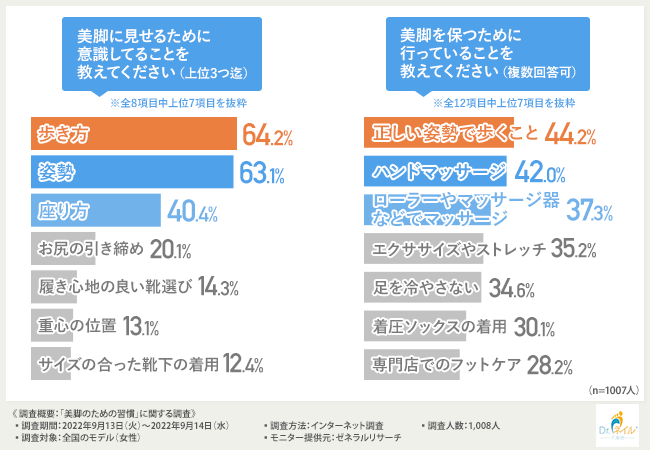 今回の調査で、モデルの方は美脚のために『歩き方』『姿勢』といったことを、日常生活を送るうえで意識することで習慣化していることが明らかになりました。