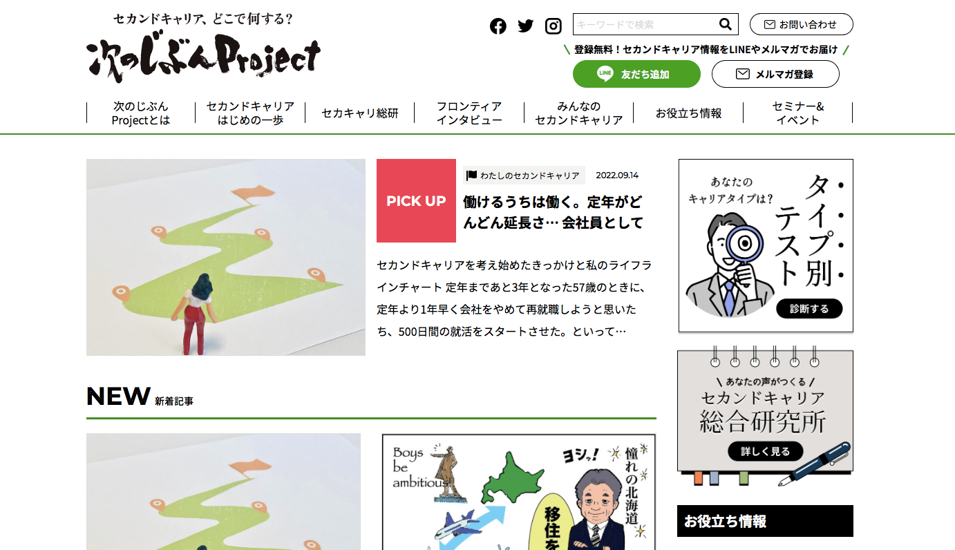 セカンドキャリアを考える上で役に立つ最新ニュースや書籍などのお役立ち情報、セカンドキャリアの最初の一歩を踏み出す時の不安や失敗など本音を語るインタビュー記事「わたしのセカンドキャリア」、地方移住の実態を紹介する「リアル移住物語」、セカンドキャリアを取り巻く課題へ新たな施策を持って取り組まれている企業や研究機関へのインタビュー記事「フロンティアインタビュー」などのコンテンツを今後発信していきます。