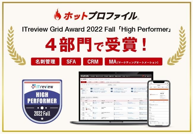 「ITreview Grid Award」とは、「ITreview」で投稿されたレビューをもとに四半期に一度ユーザーに支持された製品を表彰するものです。「ホットプロファイル」は4部門【名刺管理・SFA・CRM・MA(マーケティングオートメーション)】で顧客満足度が非常に優れた製品である「High Performer」を受賞しました。