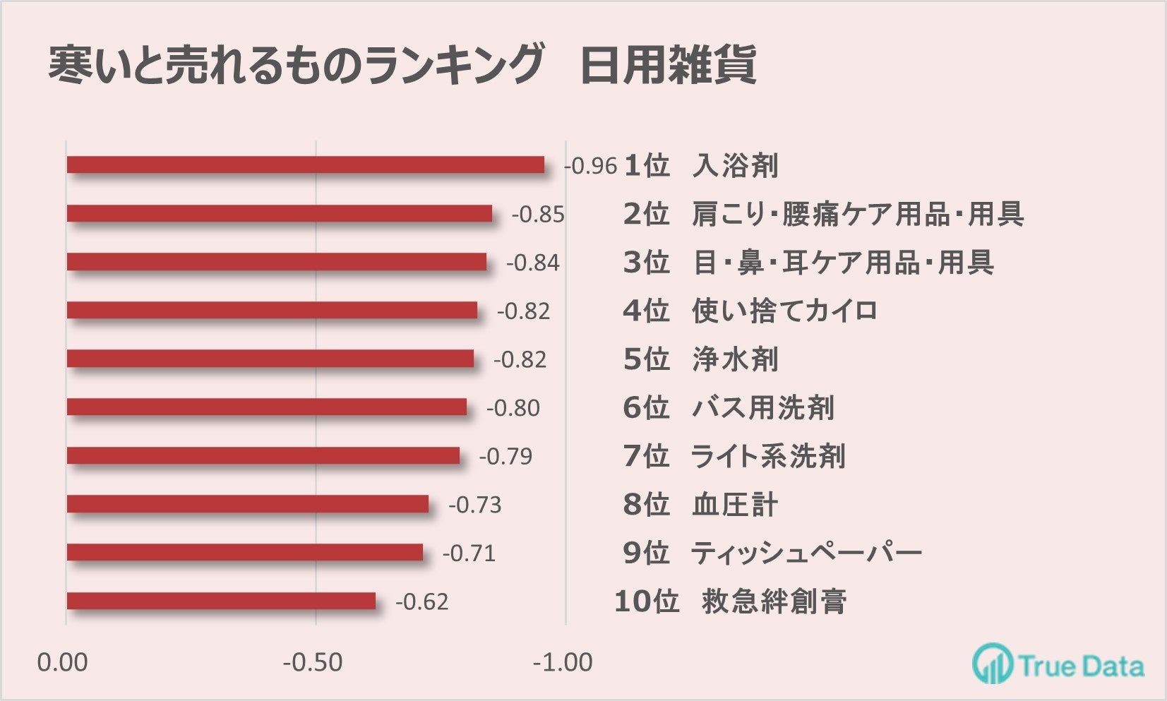 今回発表した分類の中で最も寒さと関連が強いカテゴリは、日用雑貨ランキング1位の「入浴剤」でした。気温が低下すると、湯ぶねに入る機会が増えるため-0.96と高い数値を示しました。関連する商品として「バス用洗剤」も相関係数-0.80と関係性が強く、6位にランクインしています。寒さで血行が悪くなるためか、「肩こり・腰痛ケア用品・用具」、「血圧計」も気温との強い関係性が現れました。