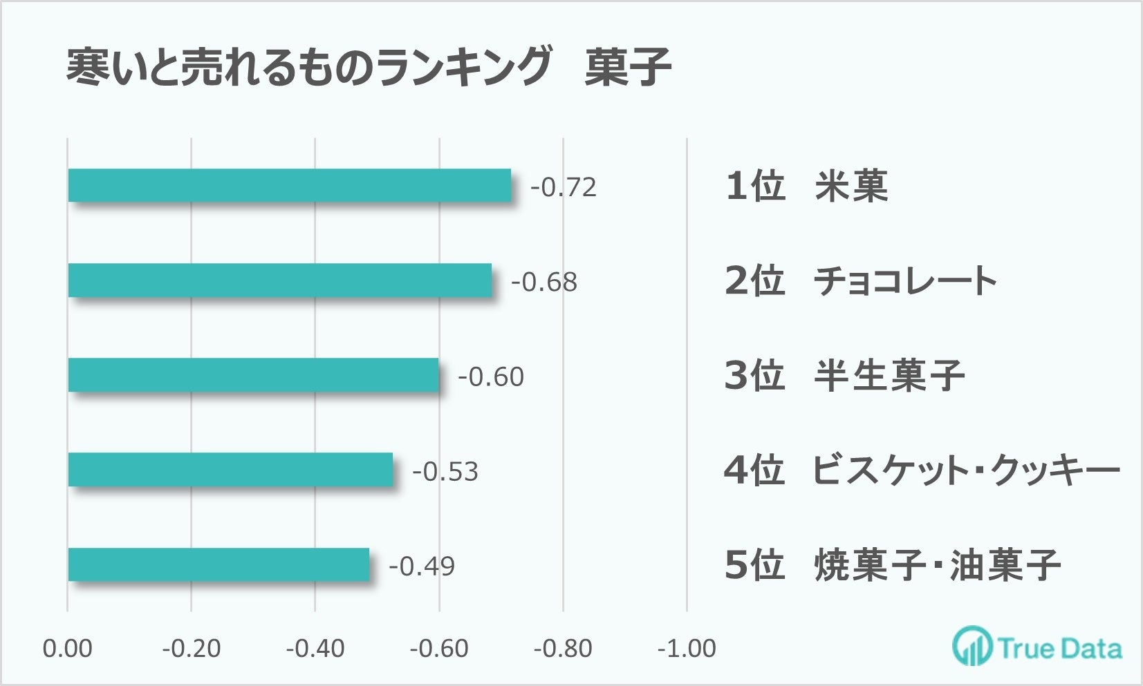 菓子のランキング1位は、温かいお茶と相性のよい「米菓」(せんべい、柿の種など)でしたが、2位以下には「チョコレート」、「半生菓子」、「ビスケット・クッキー」などの甘い菓子がランクインしています。当社の流通気象コンサルタント 常盤によると寒い季節は体がカロリーを蓄えようとするため、甘い物が好まれる傾向があるとのことです。