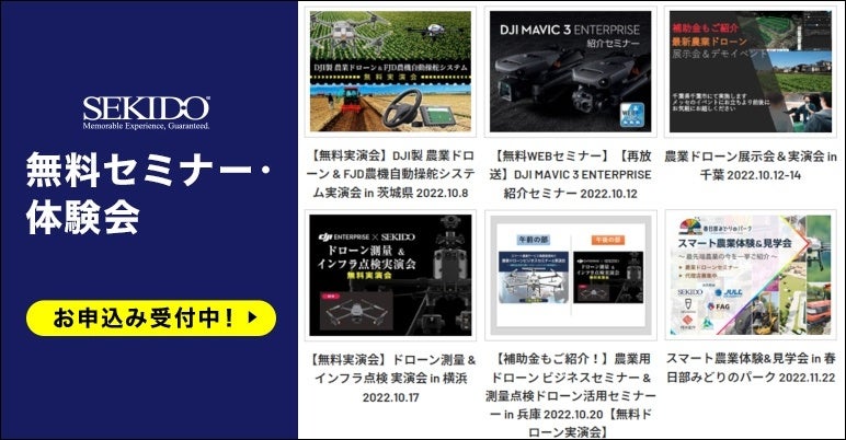 セキドでは、より多くの事業者の方にドローンを使った業務効率の改善を実現していただくため、業務用ドローンや関連ソリューションをご紹介する無料セミナーやイベントを定期的に開催しております。今後もオンラインや全国各地での開催を予定しておりますので、ぜひお気軽にご参加ください。