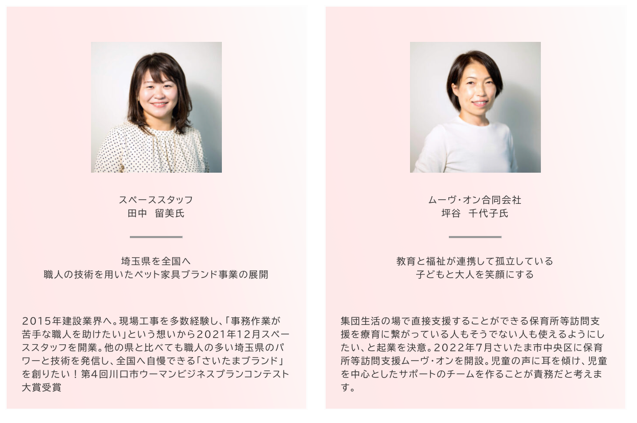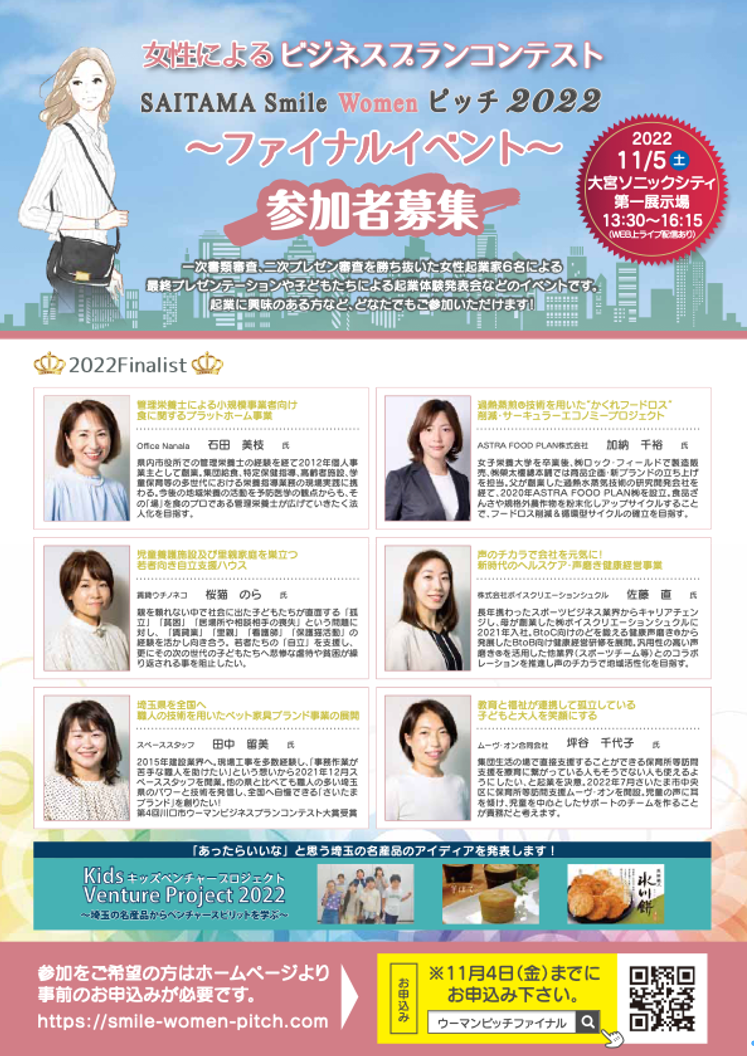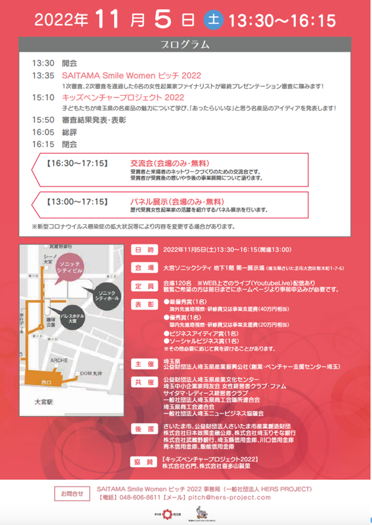 - ~埼玉県を女性起業家の街に~「SAITAMA Smile Women ピッチ」は、埼玉県と公益財団法人埼玉県産業振興公社(創業・ベンチャー支援センター埼玉)が主催する女性のためのビジネスプランコンテストです。