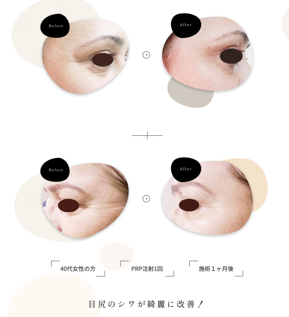 ただし、ヒアルロン酸注入と違いその場で変化の差は感じられません。効果が得られるまで3か月程度かかりますが、治療後の仕上がりはヒアルロン酸の方が異物感や透明感があるのに対し、PRP再生医療は自己組織による修復なので肌色に馴染んだ自然な仕上がりが期待できます。