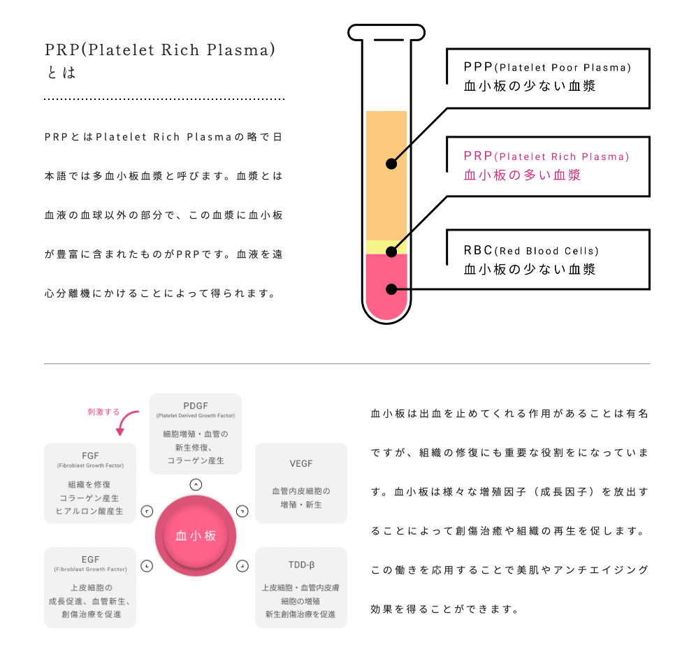 血漿(けっしょう)とは血液の血球以外の部分で、この血漿に血小板が豊富に含まれたものがPRPです。血小板は出血を止めてくれる作用があり、組織の修復にも重要な役割をになっています。この働きを応用することで美肌やアンチエイジング効果を得ることができます。