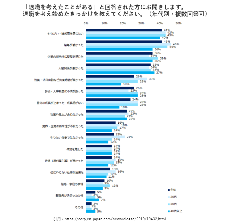 「やりがい」「給与の低さ」「企業の将来性」などが上位の理由としてランクインしています。