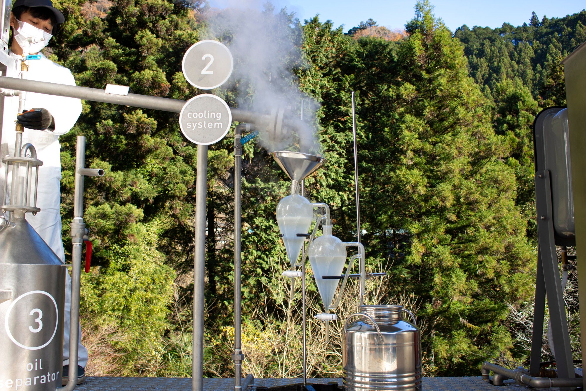 「モバイルアロマラボ」は、トラックに蒸留器を搭載した移動式蒸留装置です。エッセンシャルオイルの原料となる植物の魅力を発信することや未利用資源の活用などを目指し、日本全国の原材料の植物の産地まで赴き、精油の蒸留を行っています。これまでに、柚子・直七(高知県)、高野槙(奈良県)、三ケ日青ミカン(静岡県)、ギンバイカ(福岡県)などの蒸留を実施しました。