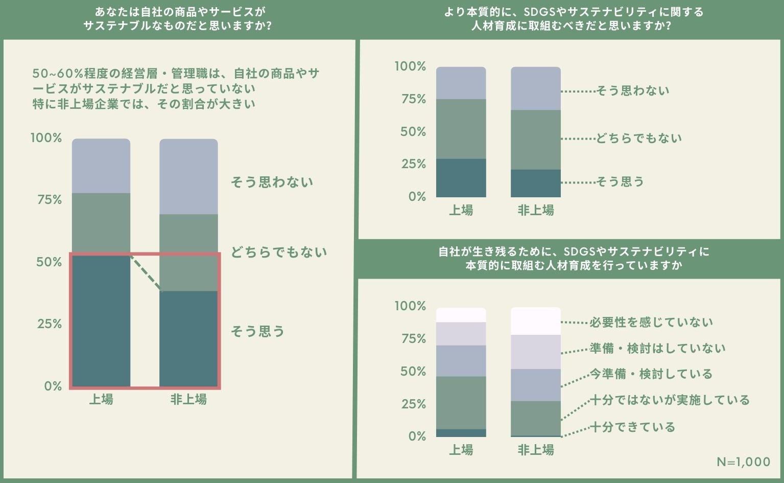 「自社の商品やサービスがサステナブルなものだと思いますか?」という質問に対して、50%〜60%の経営層・管理職は「どちらでもない」または「そう思わない」と回答し、特に非上場企業では自社の商品やサービスがサステナブルだと思う割合が小さくなりました。