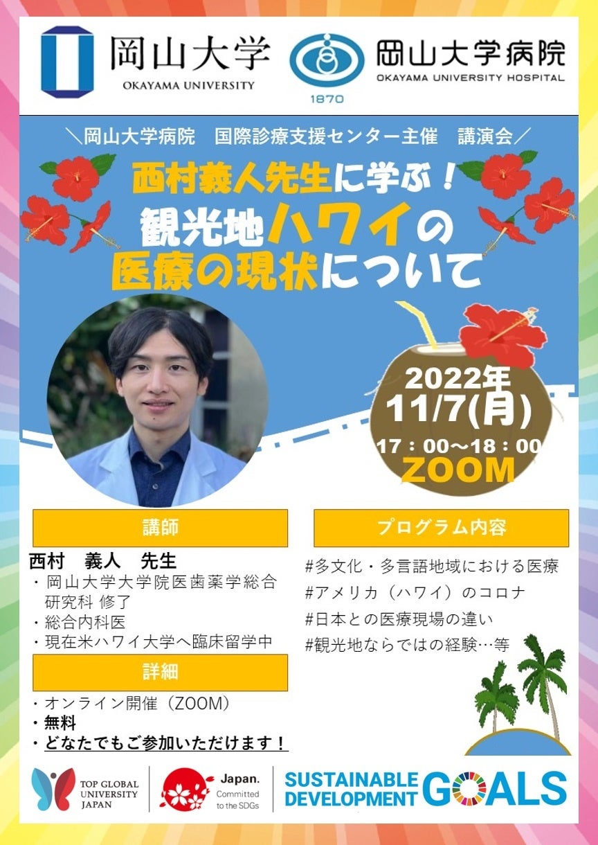 国立大学法人岡山大学(本部:岡山市北区、学長:槇野博史)の岡山大学病院国際診療支援センターは、2022年11月7日(月)に「西村義人先生に学ぶ!観光地ハワイの医療の現状について」をオンラインで開催します。