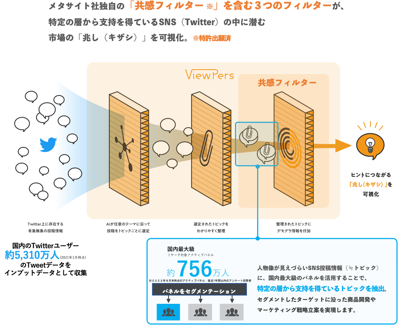 「ViewPers」は、まさにこの課題を解決に導く上で有効なツールであり、膨大なソーシャルメディアのコメントから多角的な分析が可能となることで「新しい切り口となり得る兆し」を効果的・効率的に抽出できる点が素晴らしい。