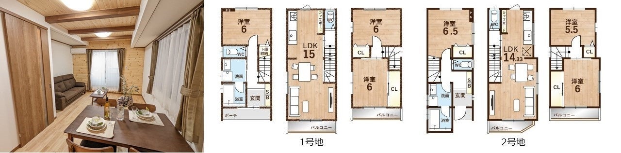 | 2号地 | 63.04㎡(19.07坪) | 79.92㎡(24.18坪) | 4,695万円 | 木造3階建 |