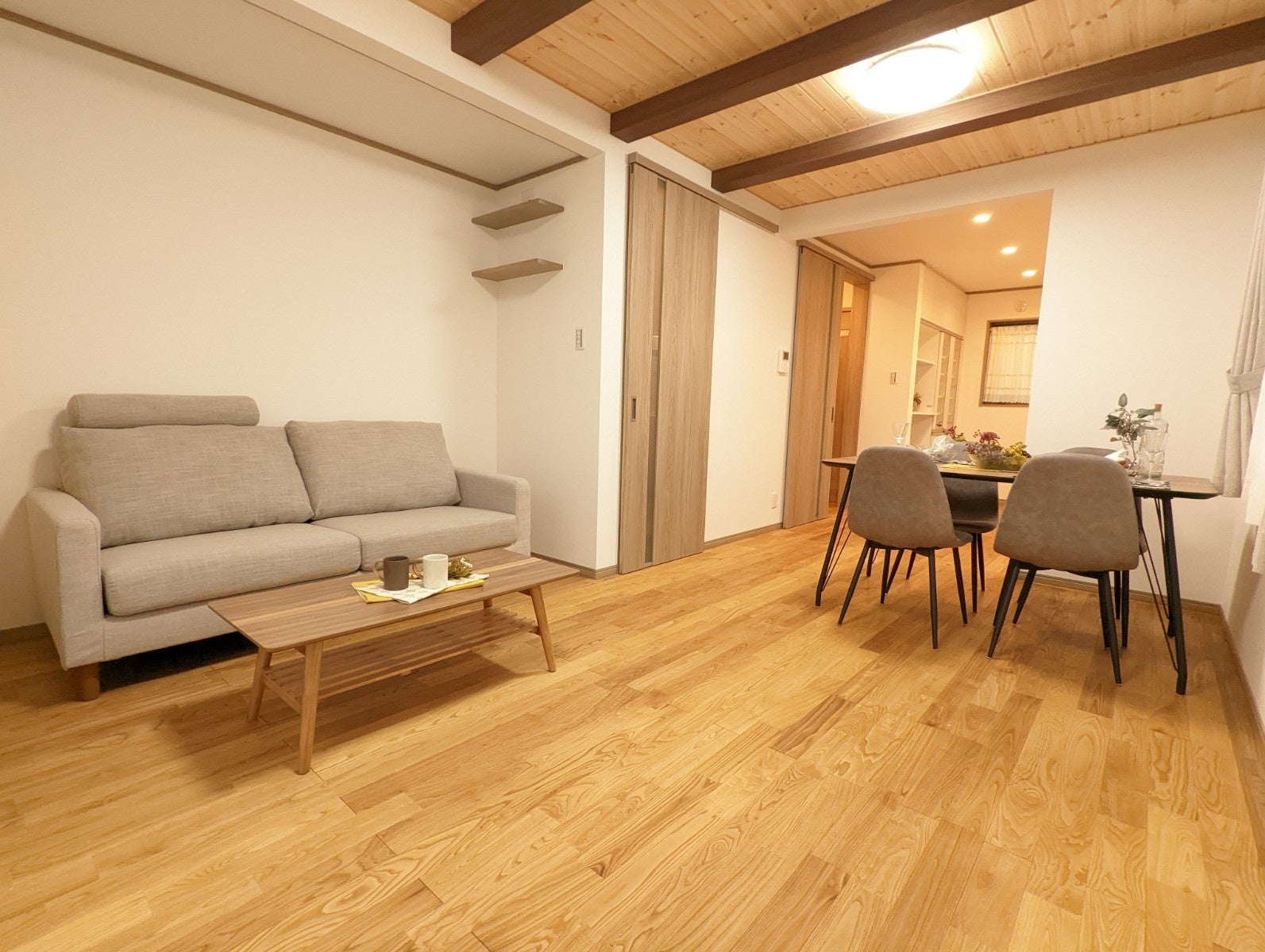 おいしいグルメや隠れた名店が沢山。魅力満載の京都一乗寺エリアに、ハートフルシリーズ“天然木の家”2区画が登場。生活利便施設がぎゅっとつまった、どんな世代の方でも暮らしやすい環境です。歩いてすぐの「高野川」には遊歩道が設置され、春の桜、秋の紅葉と、四季の移ろいを身近に感じられる市民憩いの場となっています。叡山本線「修学院/一乗寺」駅まで徒歩7分、地下鉄「松ケ崎」駅までも徒歩17分と、毎日の通学や通勤にも便利な立地です。ガレージ部分は強度の高いスタンプコンクリートを施工。内装はおしゃれな北欧ログハウス調となっております。