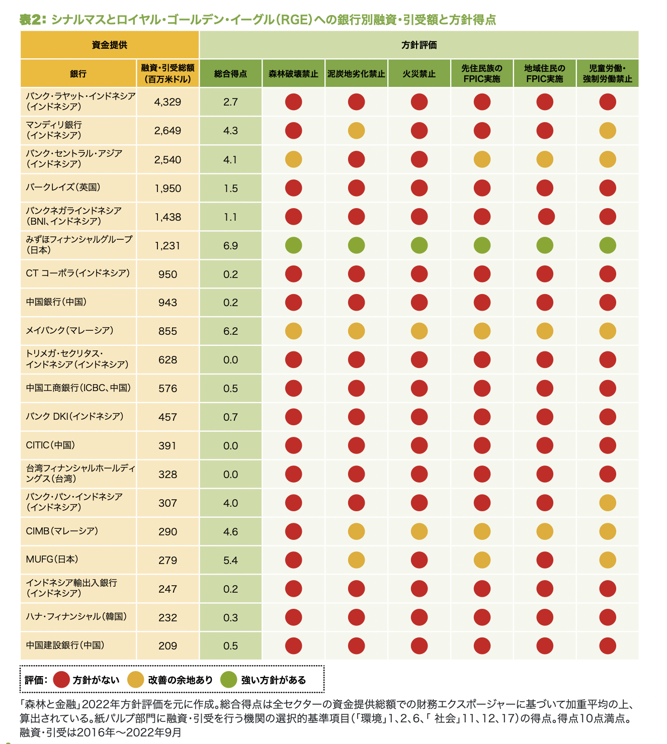 ●メガバンクの方針評価はMUFGが5.4ポイント、みずほは6.9ポイントと高評価を得るも、問題の多いインドネシアの紙パルプ大手2グループに多額の資金を提供している。