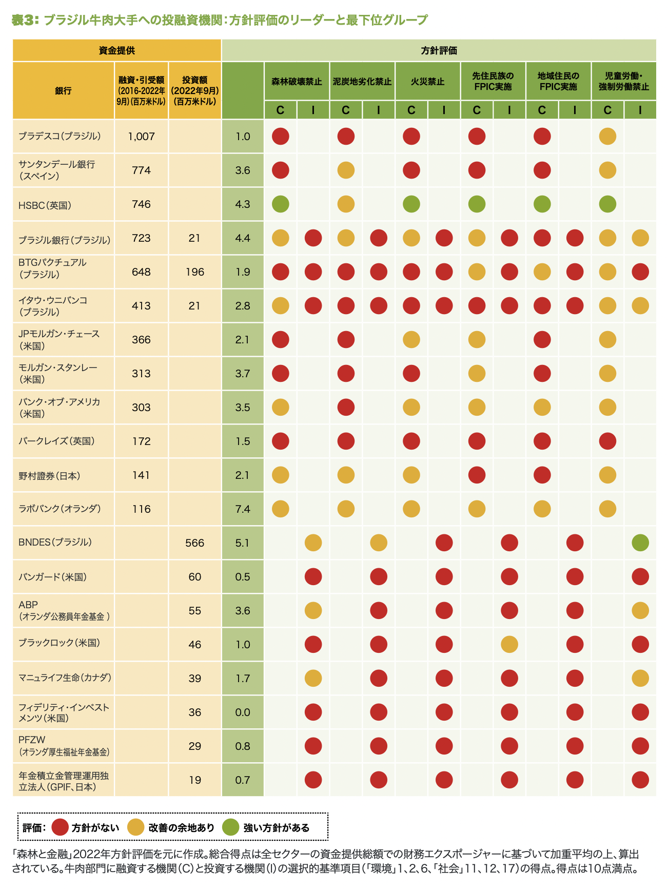 注4)方針評価の方法論:200の大手銀行・投資機関の公開されている方針を環境・社会・ガバナンス(ESG)の3分野35項目の基準で採点・分析。各金融機関が基準項目に明確に取り組み、対象企業とサプライヤーに基準を適用していれば10点、サプライヤーに基準が適用されていないなど部分的遵守は8.5点とした。そして35項目の合計得点を0から10ポイントに標準化した。また産品別でも採点され、各金融機関の投融資額の合計に各産品事業が占める割合を算出し、加重平均の上、合計した数字を総合得点とした。