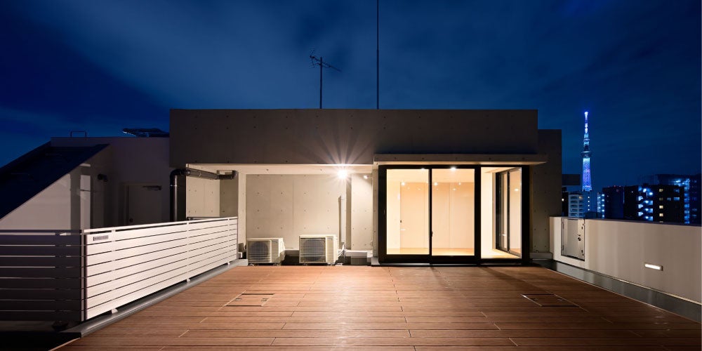 外観は、周囲の景観を損なわずコンクリート打放しの力強さを強調するシンプルなデザインとしています。「自分だけの住まい」をシンボリックに表した“囲い”のダイアグラムをマリオンで表現しながら、透明度のあるガラス手摺によって開放感を強調しています。